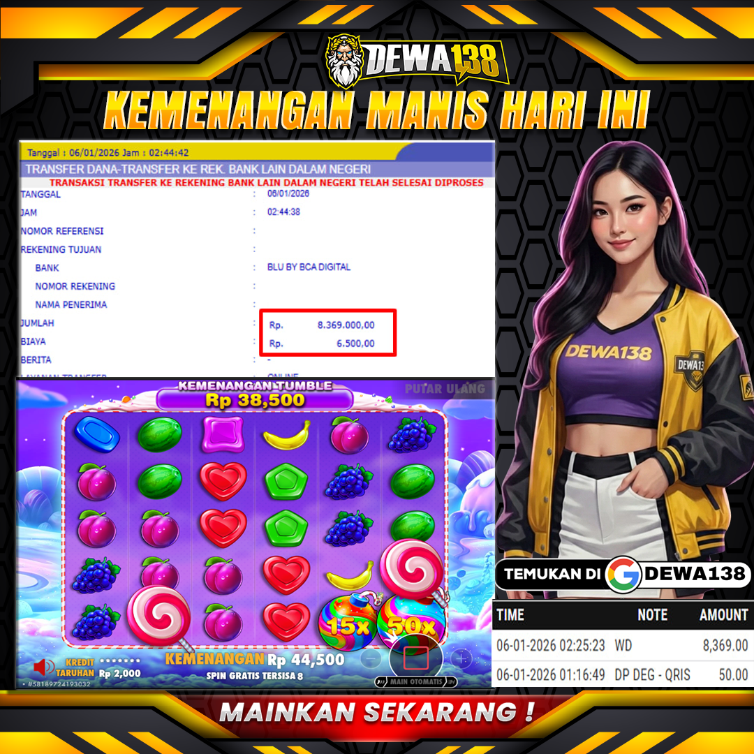 Gabung bersama DEWA138 dan Dapatkan kesempatan jackpot sensasional dalam 15 menit seperti bukti banner ini bukan sekedar janji hanya Depo 50k Withdraw 8,3+ juta hari ini.